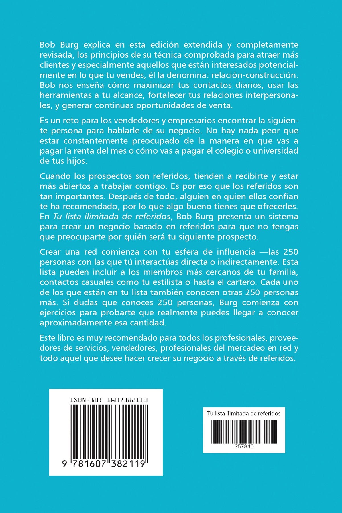Cuando los prospectos son referidos, tienden a recibirte y estar más abiertos a trabajar contigo. Es por eso que los referidos son tan importantes. Después de todo, alguien en quien ellos confían te ha recomendado, por lo que algo bueno tienes que ofrecerles. En Tu lista ilimitada de referidos, Bob Burg presenta un sistema para crear un negocio basado en referidos para que no tengas que preocuparte por quién será tu siguiente prospecto.